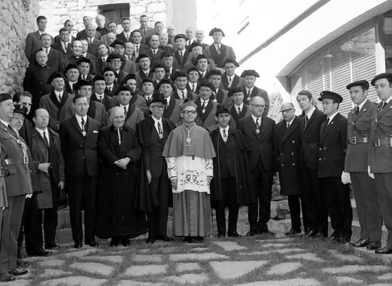 Fotografia oficial a les escales de la Casa de la Vall. D’esquerra a dreta trobem el veguer francès Hubert Dubois, el delegat permanent de la Mitra Gregori Creus, el síndic general Francesc Escudé, el copríncep episcopal Joan Martí Alanis, el subsíndic Eduard Rossell i el veguer episcopal Jaume Sansa.